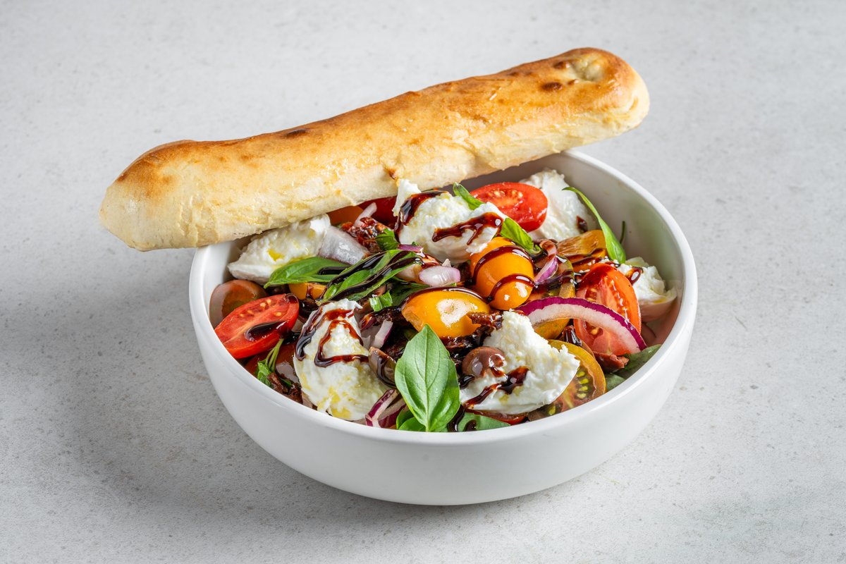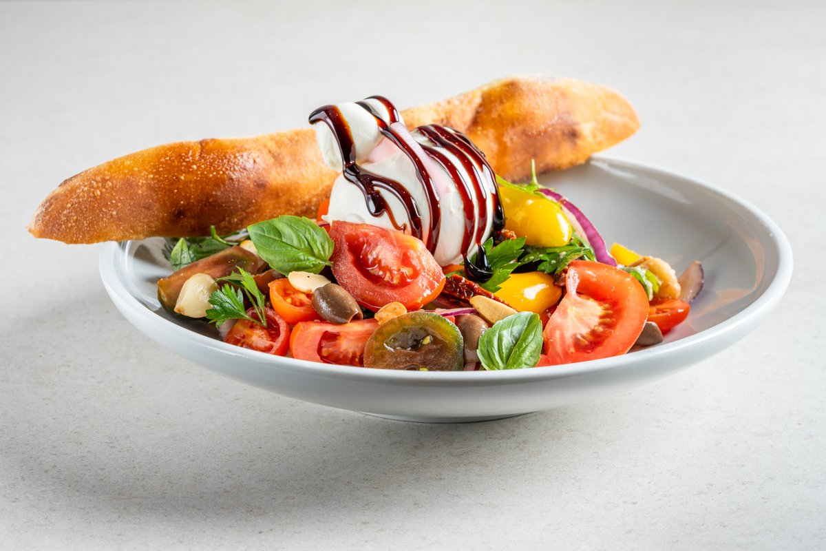 מיקס עגבניות, קרעי מוצרלה, עגבניות מיובשות, שום קונפי, בצל סגול, זיתי קלמטה, נענע, בזיליקום ופטרוזיליה מתובל בלימון ושמן זית, בלסמי מצומצם מוגש עם פוקצ'ינה