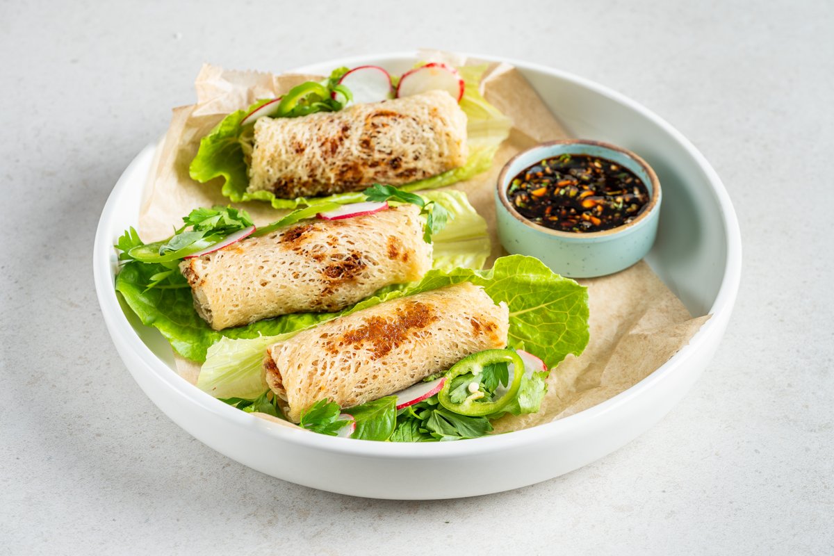 רול קריספי ממולא בירקות מונח בעלה חסה, צ'ילי ירוק, צנונית ועלים ירוקים מוגש עם רוטב וייטנאמי