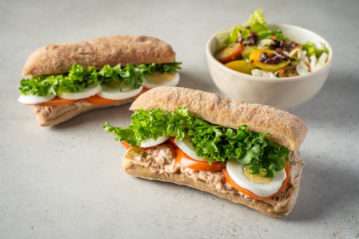 סלט טונה, ביצה קשה, חסה, עגבנייה ומלפפון חמוץ בלחם לבחירה מוגש עם סלט לבחירה