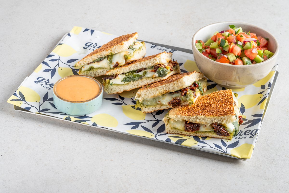פסטו, בולגרית, שמנת לימונית, פלפל וחציל קלוי בלחם לבחירה מוגש עם סלט לבחירה