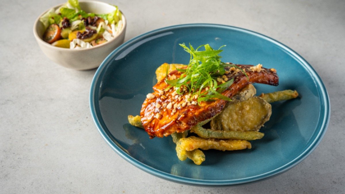 פילה סלמון מושרה ברוטב מיסוי יפני מוגש עם ירקות בטמפורה וסלט לבחירה