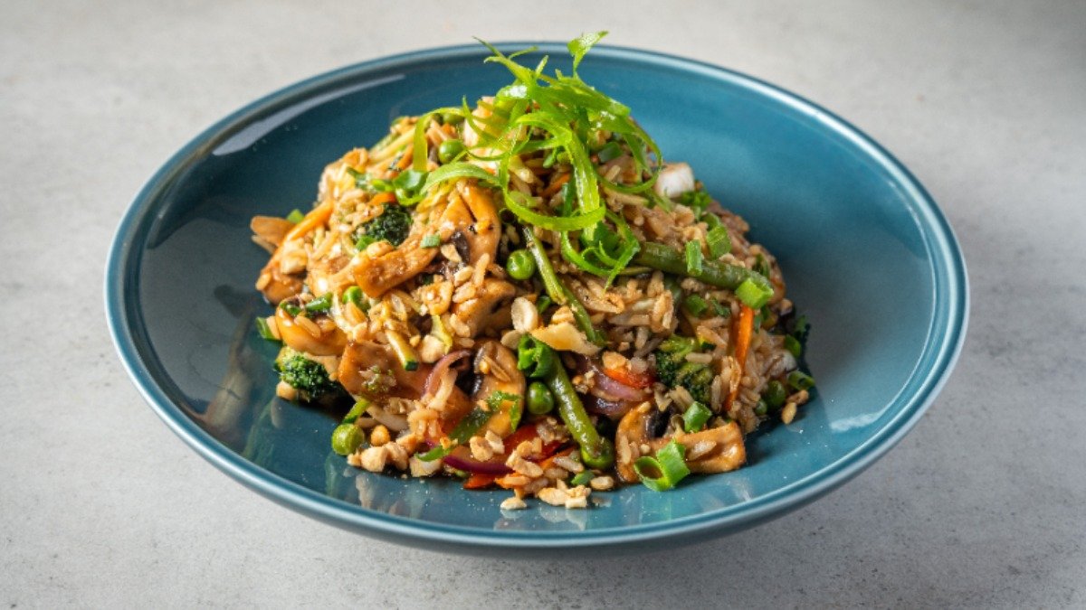 אורז מוקפץ עם בצל, זוקיני, כרוב, פטריות, גזר, ברוקולי ובצל ירוק מוקפצים ברוטב סויה הדרים ובוטנים גרוסים