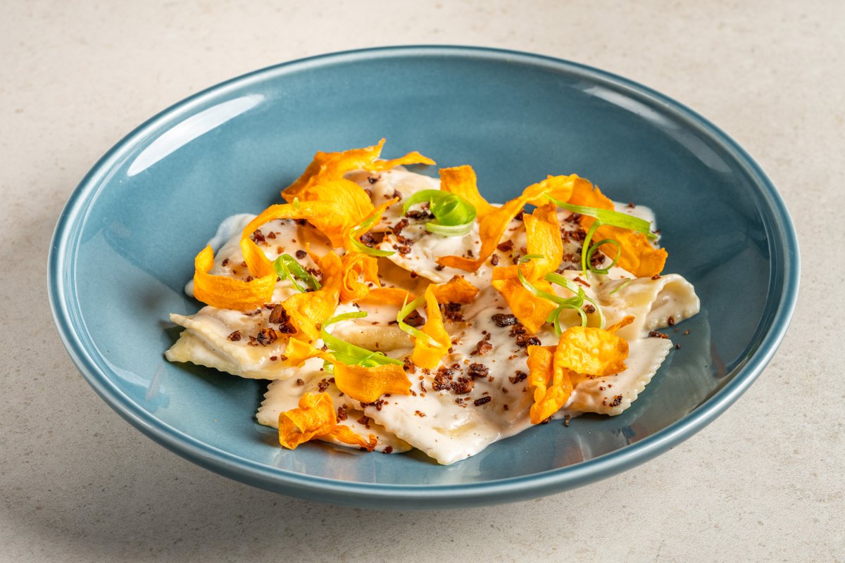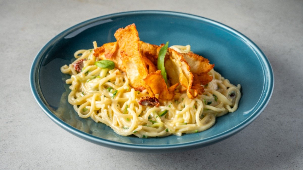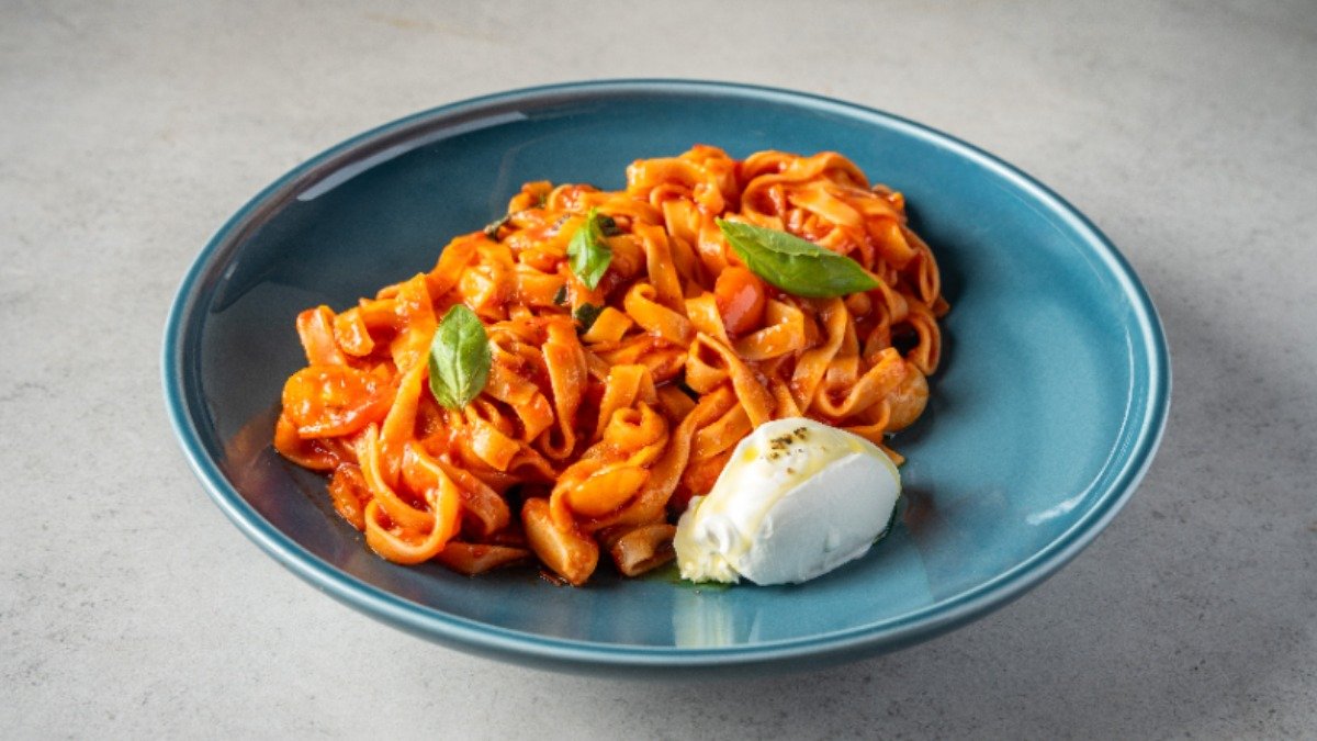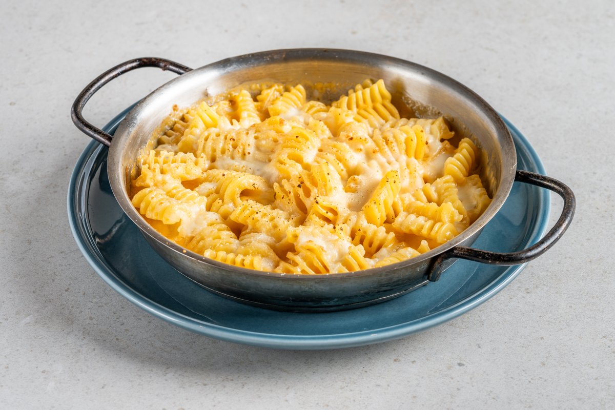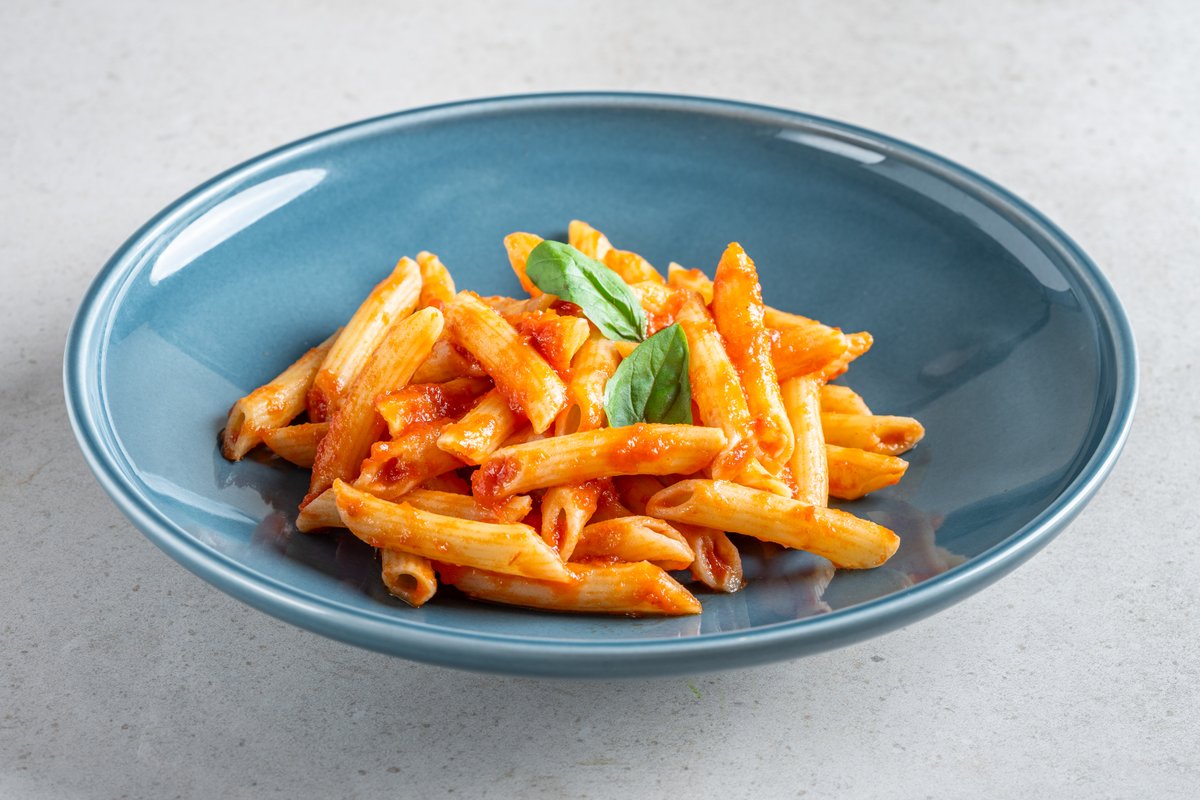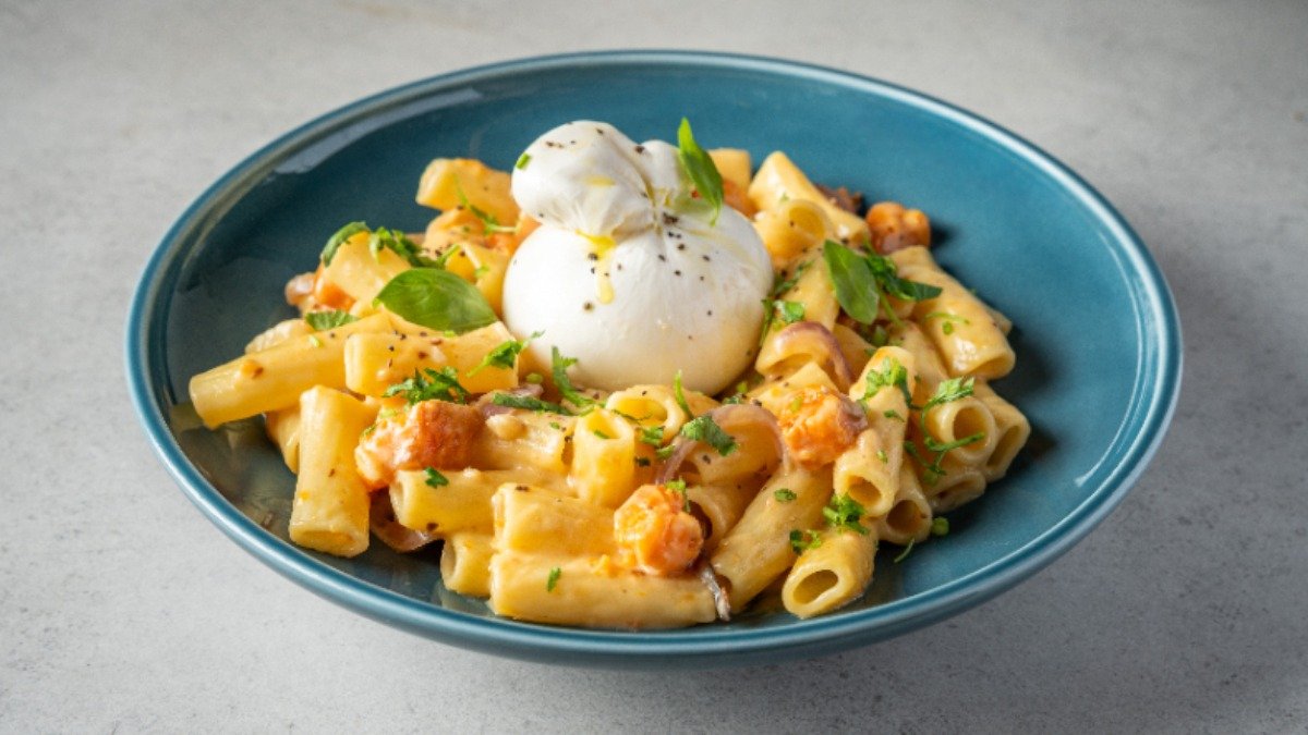 פסטה ריגטה עם בצל ושום, קוביות בטטה צלויות, רוטב פונדו, עליי בזיליקום, פטרוזליה וגבינת בוראטה