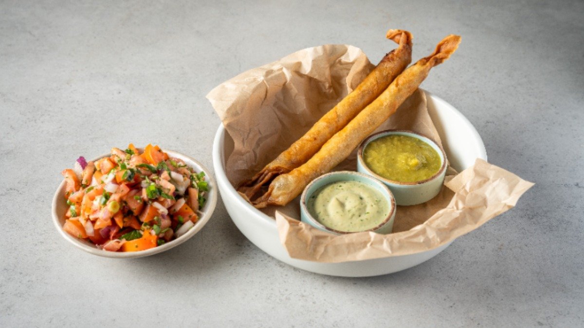 קריספי רול במילוי אבוקדו, עגבניות מיובשות, בצל סגול וכוסברה מוגש גם רוטב עשבי תיבול לימון ודבש