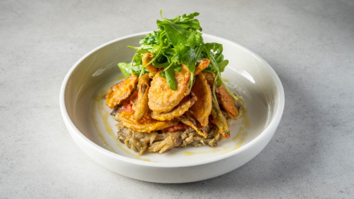 חציל, שעועית ירוקה ודלעת יפנית קריספי, מונחים על טרטר חציל, סלסת עגבניות, סלטון עלים ושמן זית