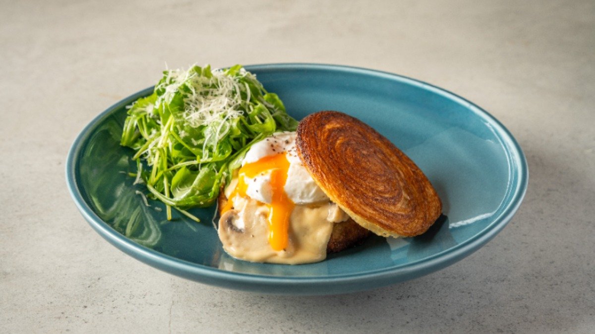 קרואסון עם מיקס פטריות וכמהין, רוטב עמק , ביצה עלומה, סלטון ארוגולה ופרמז׳ן