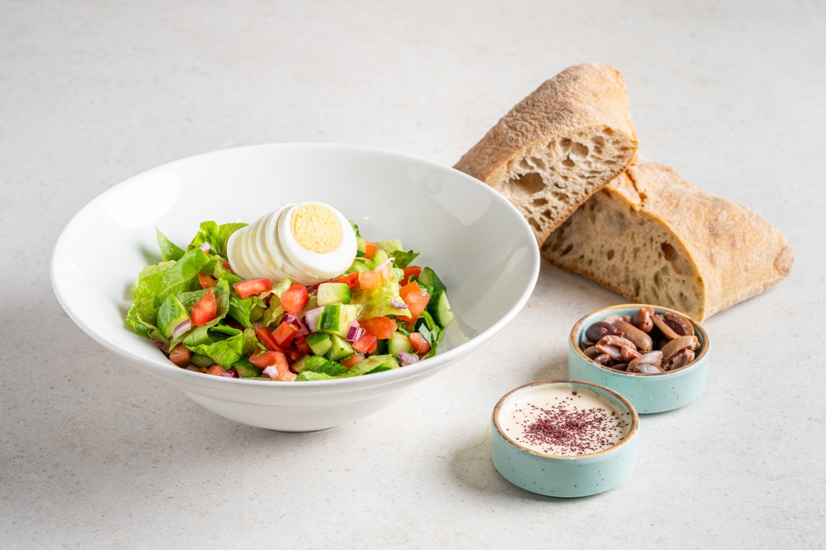 מלפפון, עגבנייה, בצל, חסה ופטרוזיליה קצוצים ומתובלים בשמן זית לימון, טחינה גולמית, ביצה קשה עם זיתי קלמטה וטחינה מוגש עם לחם לבחירה