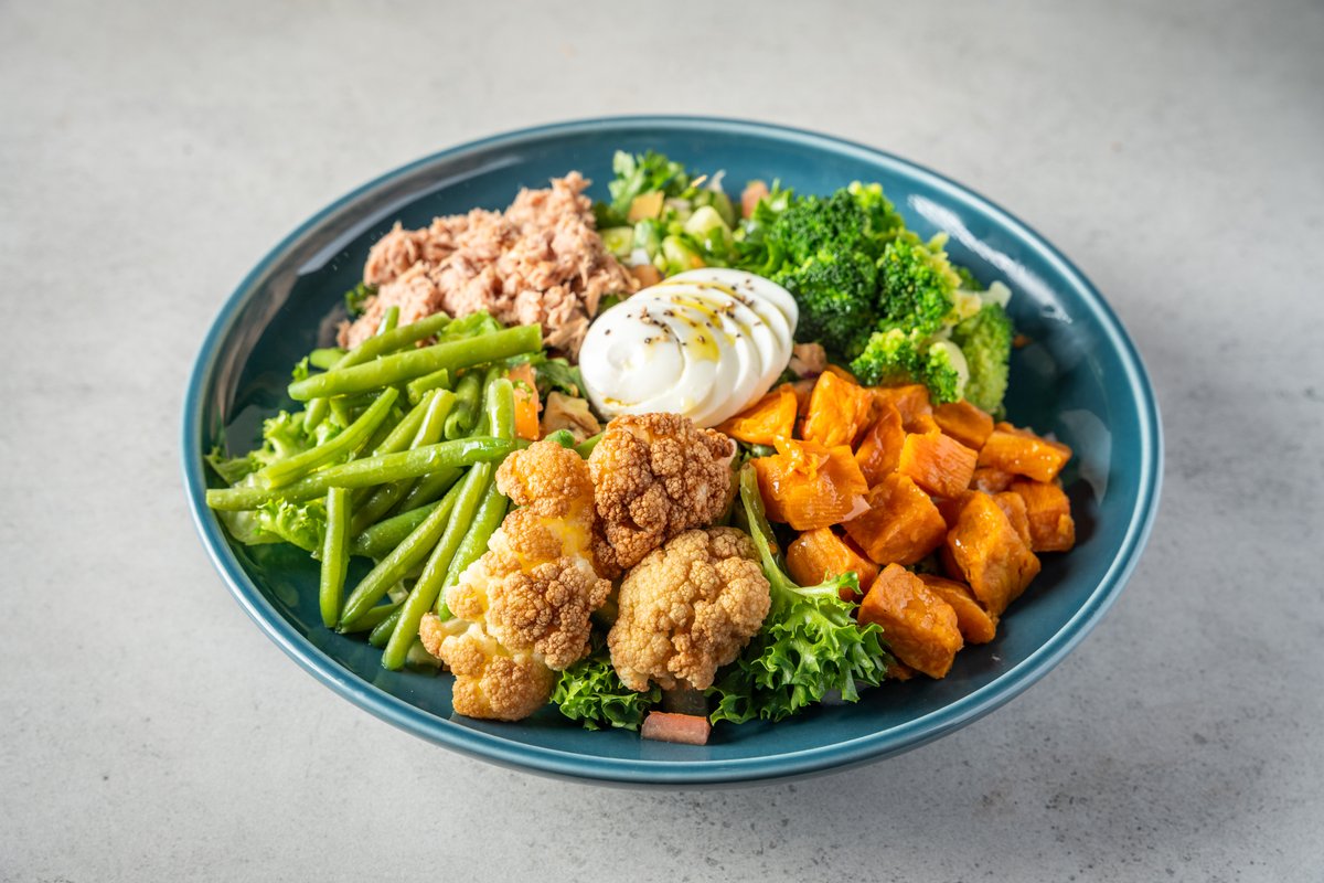 טונה, ביצה קשה, תפוח אדמה ושעועית ירוקה מאודים, צנונית, עגבניות שרי, מלפפון, זיתי קלמטה, מלפפון חמוץ, חסה, כרוב וגזר מתובלים בשמן זית ולימון מוגש עם לחם לבחירה
