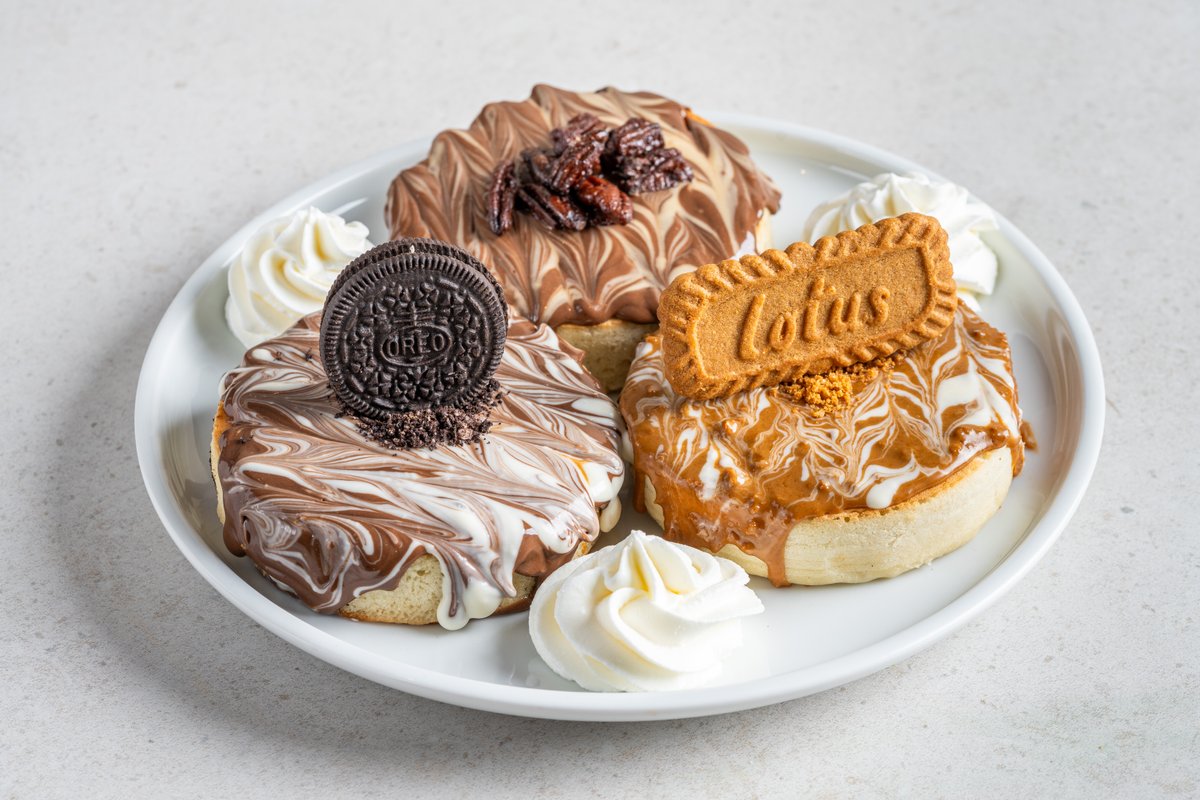 פנקייקים במבחר טעמים: לוטוס, אוראו וקינדר מוגש עם קצפת