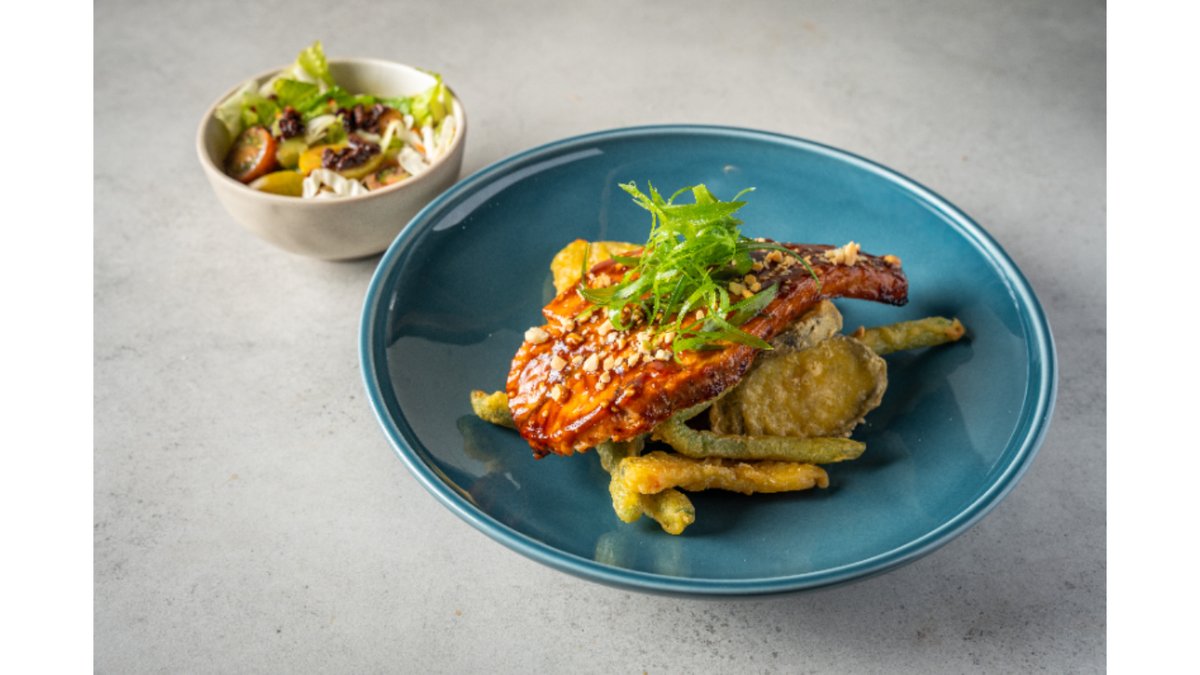 פילה סלמון מושרה ברוטב מיסוי יפני מוגש עם ירקות בטמפורה וסלט לבחירה