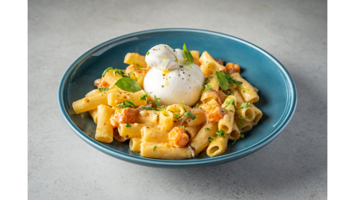 פסטה ריגטה עם בצל ושום, קוביות בטטה צלויות, רוטב פונדו, עליי בזיליקום, פטרוזליה וגבינת בוראטה