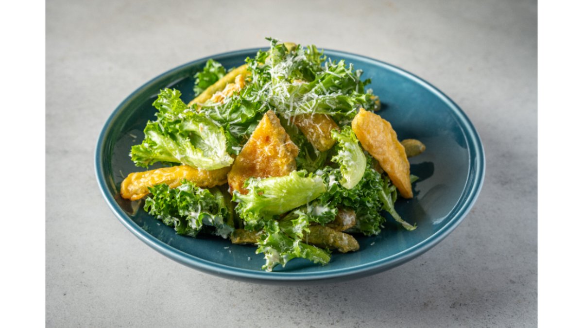 חציל, שעועית ירוקה ודלעת יפנית קריספי, מונחים על טרטר חציל, סלסת עגבניות, סלטון עלים ושמן זית