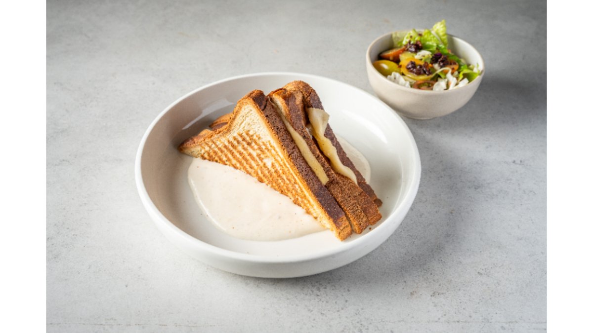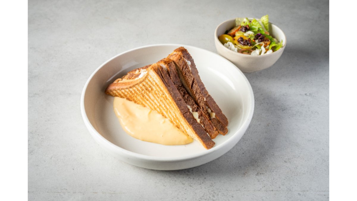 קסטן ענק, גבינת שמנת, צהובה, עגבנית שמש ובולגרית, עלי בזיליקום ורוטב פונדו חם מוגש עם סלט לבחירה