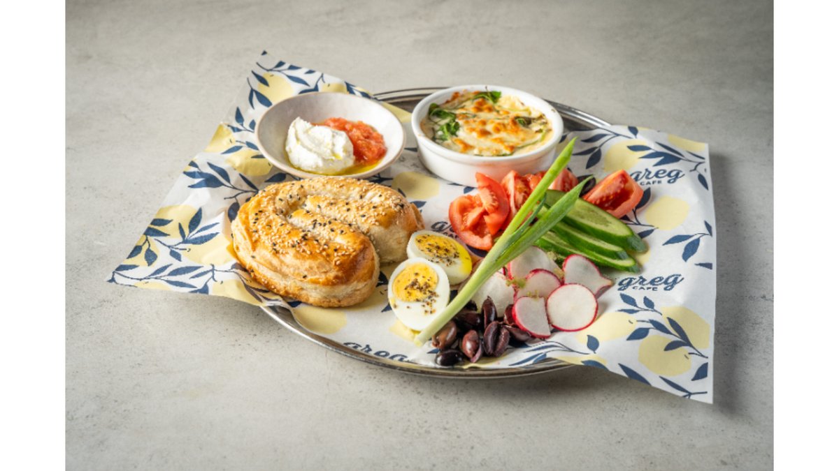 מאפה בצק עלים במילוי מנגולד וגבינות מוגש עם ביצה קשה, קאימק עגבניות מרוסקות, פונדו תרד וגבינות וירקות שוק