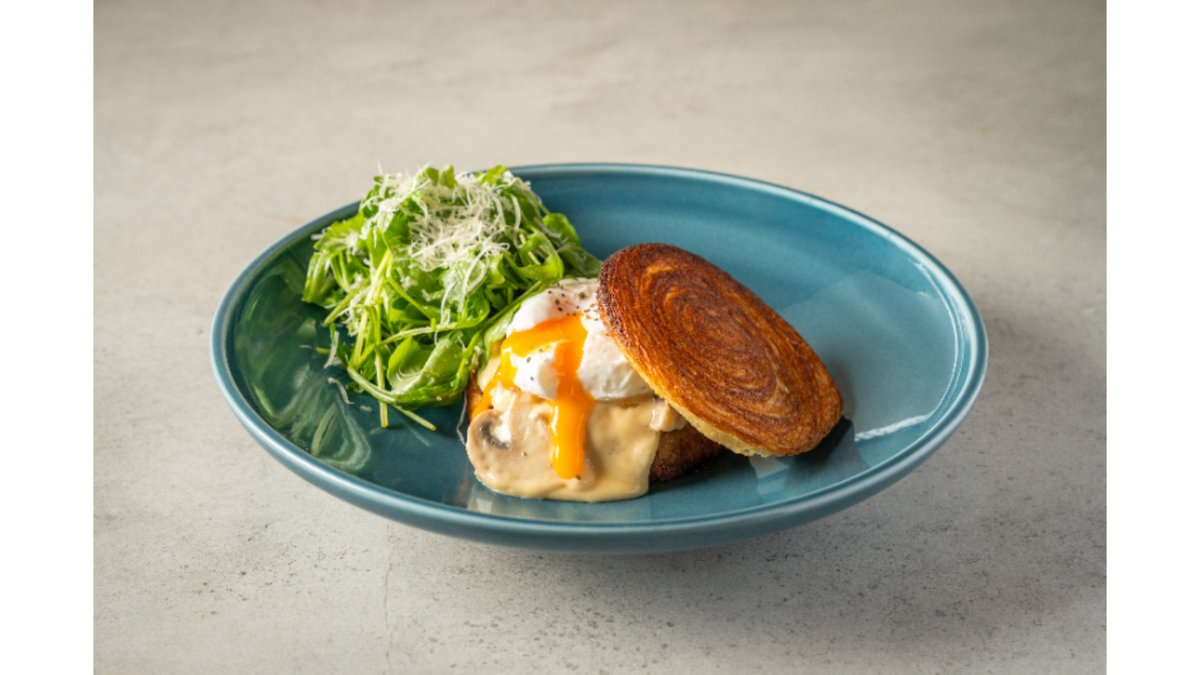 קרואסון עם מיקס פטריות וכמהין, רוטב עמק , ביצה עלומה, סלטון ארוגולה ופרמז׳ן