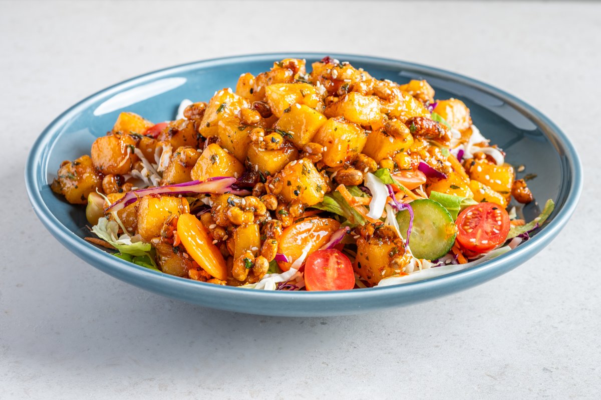 קוביות בטטה אפויות, גבינה בולגרית מגורדת, צ'יפס בטטה, חסה, כרוב, עגבניות שרי, גזר ומלפפון מתובל בויניגרט ותערובת גרעינים קלויים