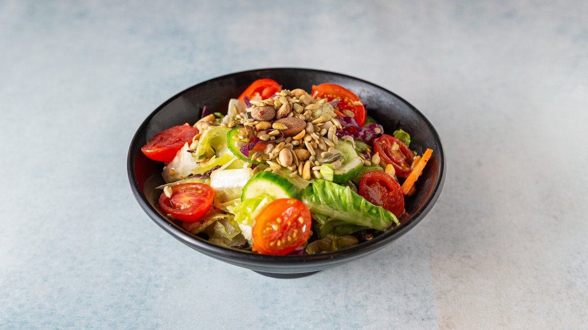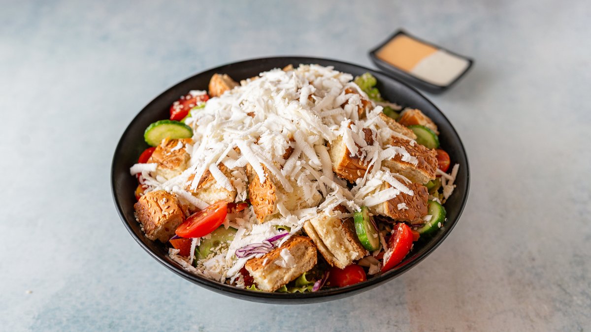 קוביות טוסט, גבינה בולגרית, חסה, עגבניות שרי, כרוב לבן, כרוב אדום, גזר, מלפפון, פיצוחים ורוטב וויניגרט