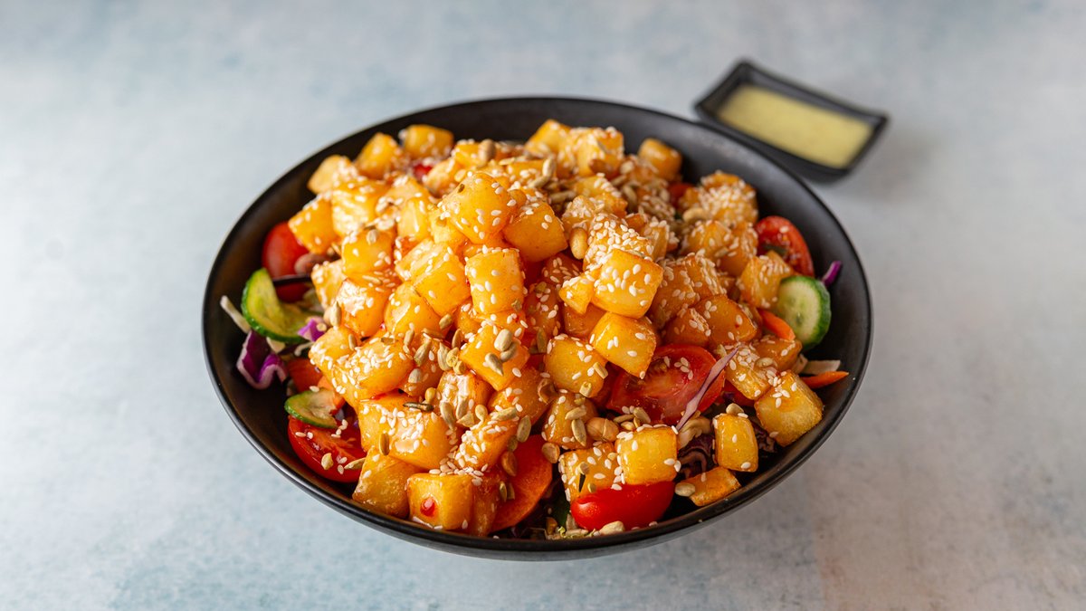 קוביות תפוחי אדמה מטוגנות, חסה, עגבניות שרי, כרוב לבן, כרוב אדום, גזר, מלפפון, רוטב צ'ילי, פיצוחים, אגוזי מלך ורוטב וויניגרט