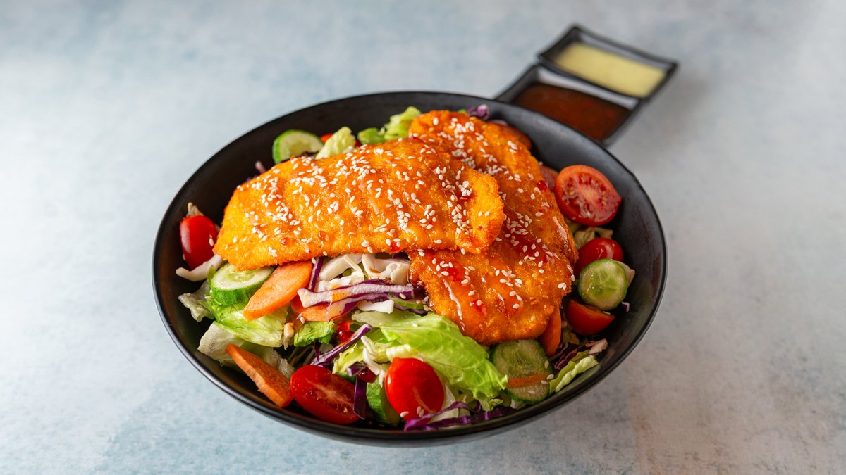 שניצל, פטריות טריות, חסה, עגבניות שרי, כרוב לבן, כרוב אדום, גזר, מלפפון, בצל, פיצוחים, אגוזי מלך ורוטב וויניגרט
