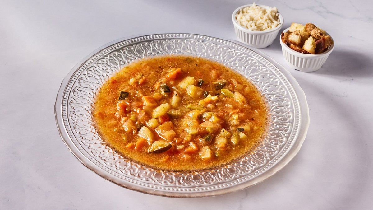 עשיר קוביות זוקיני, גזר, תפוחי אדמה, סלרי, עגבניות ובצל ללא גלוטן