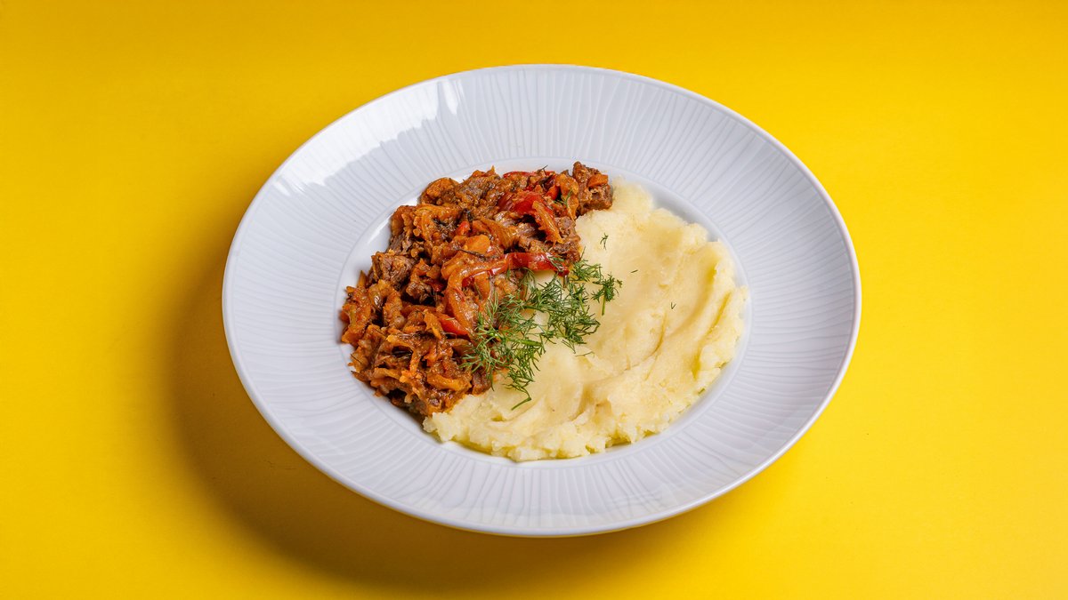 נתחי בשר עגל מבושלים ברוטב עגבניות קלויות ובצל מקורמל, מוגש עם פירה