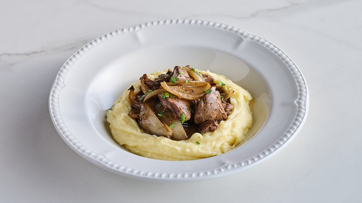 כבדי עוף עם בצל צלוי, סלסה ורדא, פטרוזיליה ומוגש עם פירה