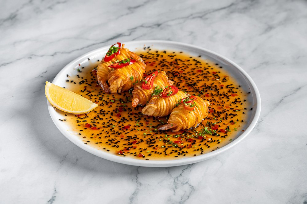 שרימפס פריכים עטופים ברצועות תפוחי אדמה קריספיות ברוטב צ'ילי תפוזים פיקנטי