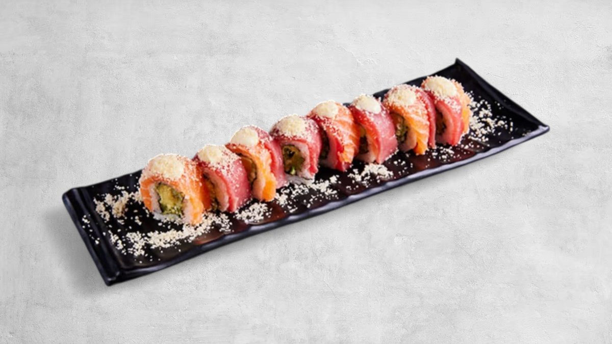 רול עטוף סלמון וטונה במילוי אבוקדו, מלפפון , עירית וצנון יפני כבוש, מיונז יוזו ופירורי טמפורה