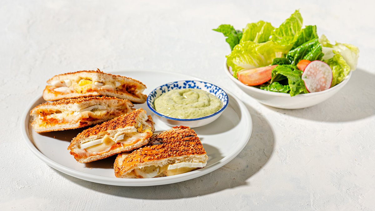 גבינה צהובה, ביצה, ממרח עגבניות מיובשות, שמן זעתר מוגש עם איולי פסטו לטבילה וסלט ירוק לריענון בין הביסים