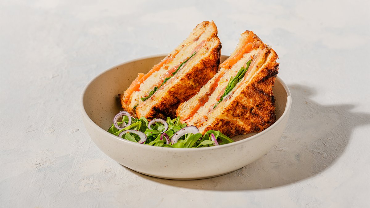 שלוש פרוסות קלויות של לחם בריוש עם סלמון מעושן וגבינה צהובה, רוטב רויאל, פרוסות עגבנייה ורוקט. מוגש עם סלטון רוקט