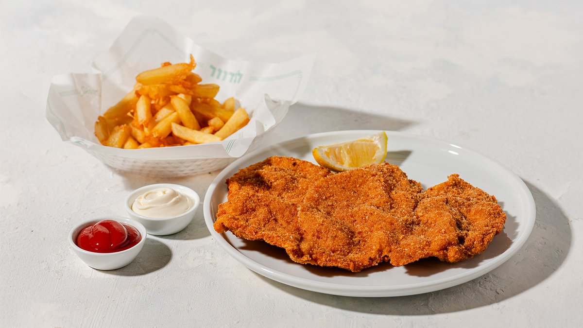 שניצל זהוב בציפוי פריך, מוגש פלח לימון לסחיטה, סלט ירוק ותוספת לבחירה