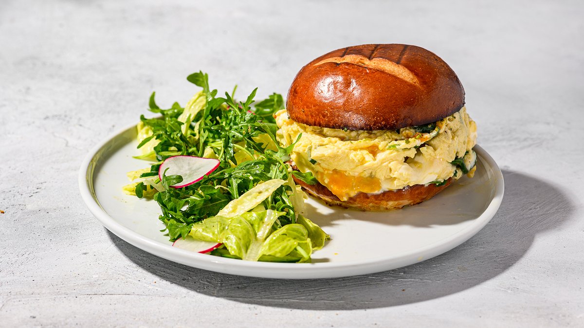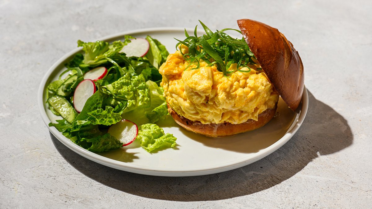 לחמניית בריוש רכה עם חמאה, מפוצצת במקושקשת צ’דר, מוצרלה ובצל ירוק. בצד סלט ירוק בווינגרט פרובנס אלרגנים: גלוטן, לקטוז וביצים