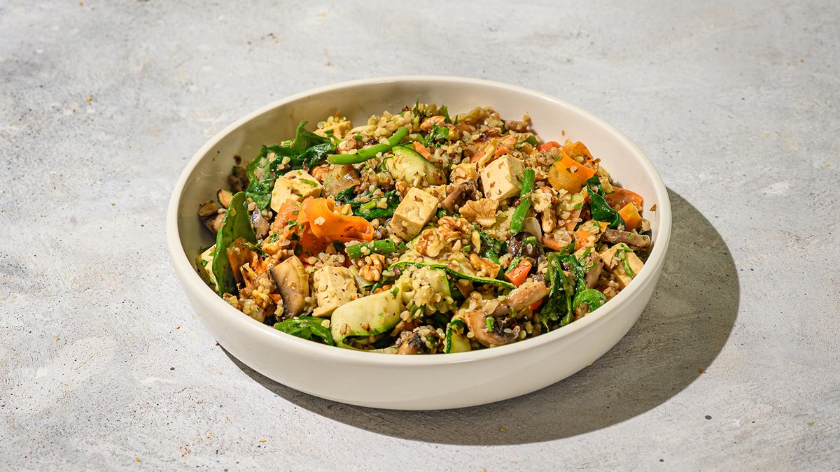 תבשיל עשיר של כוסמת מוקפצת עם טופו, פטריות , גזר, בצל צלוי, זוקיני, תרד, שעועית עדינה, טחינה גולמית, סילאן, פטרוזיליה קצוצה ואגוזי מלך