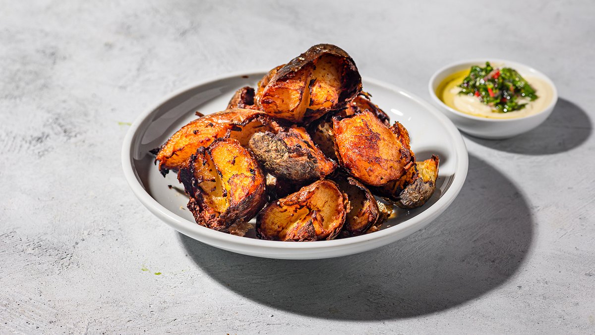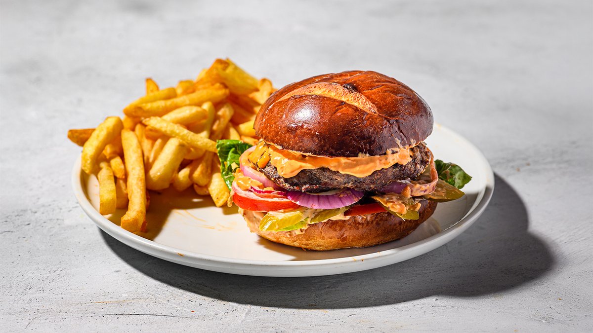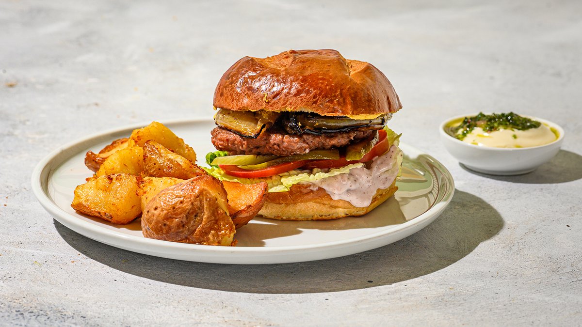 קציצת ביונד (113 גרם) עם בצל צלוי, חסה, עגבנייה, מלפפון חמוץ, חרדל ואיולי בצל בסומק מוגשת עם קרעי תפוחי אדמה צלויים ואיולי טבעוני עם סלסה ורדה