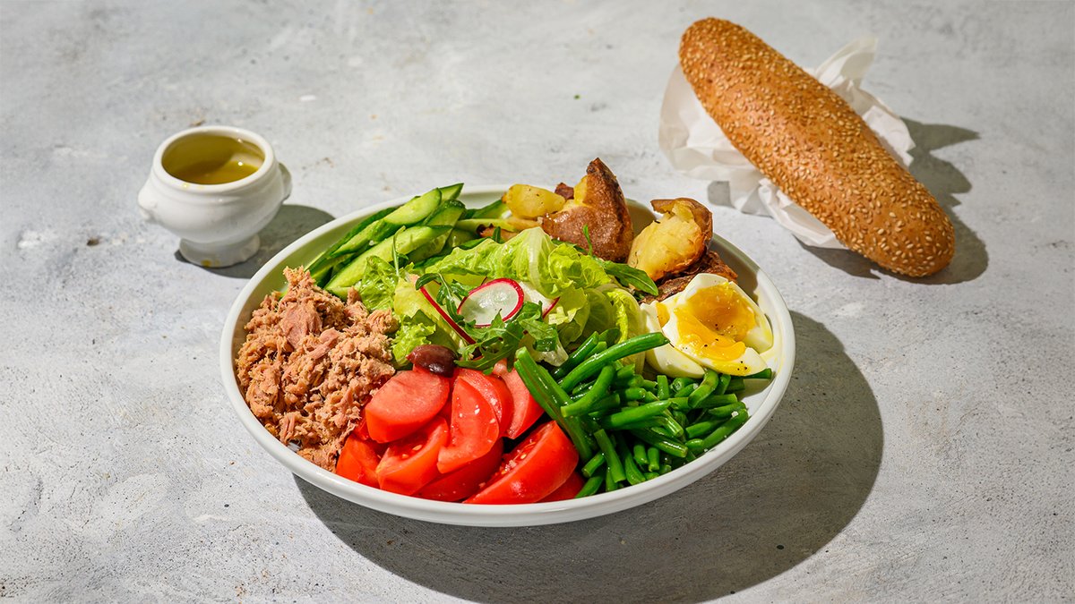 סלט של עגבניות, מלפפונים, צנוניות, חסה קיסר ורוקט עם ביצה רכה, טונה, קרעי תפוחי אדמה צלויים, שעועית ירוקה עדינה וזיתי קלמטה בתיבול ים תיכוני של לימון ושמן זית