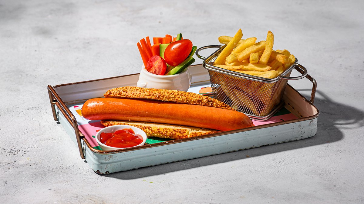 נקניקיית עוף צלויה בלחמנייה מוגשת עם צ'יפס, קטשופ, מיונז וירקות טריים חתוכים
