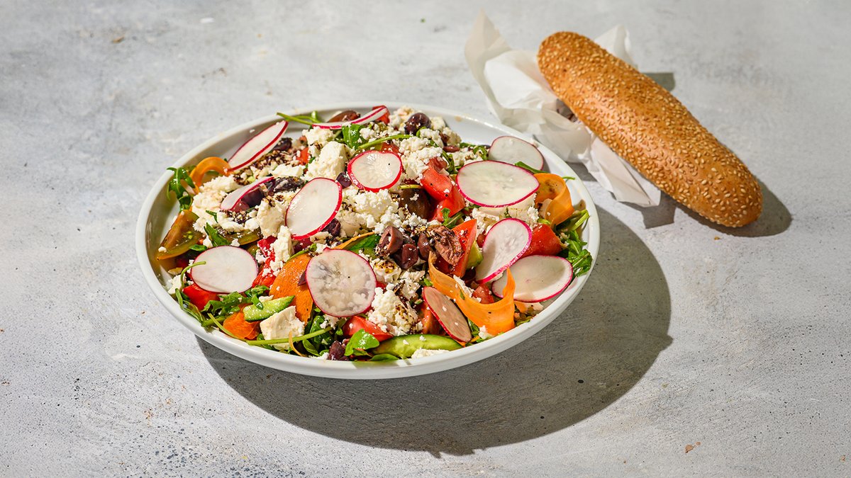 כל הטוב שהשמש והאדמה נתנו, סלט של עגבניות, מלפפונים, פלפל, קולפניות גזר, צנוניות ורוקט עם זיתי קלמטה וגבינה בולגרית. בתיבול של שמן זעתר וסומק עם לימון