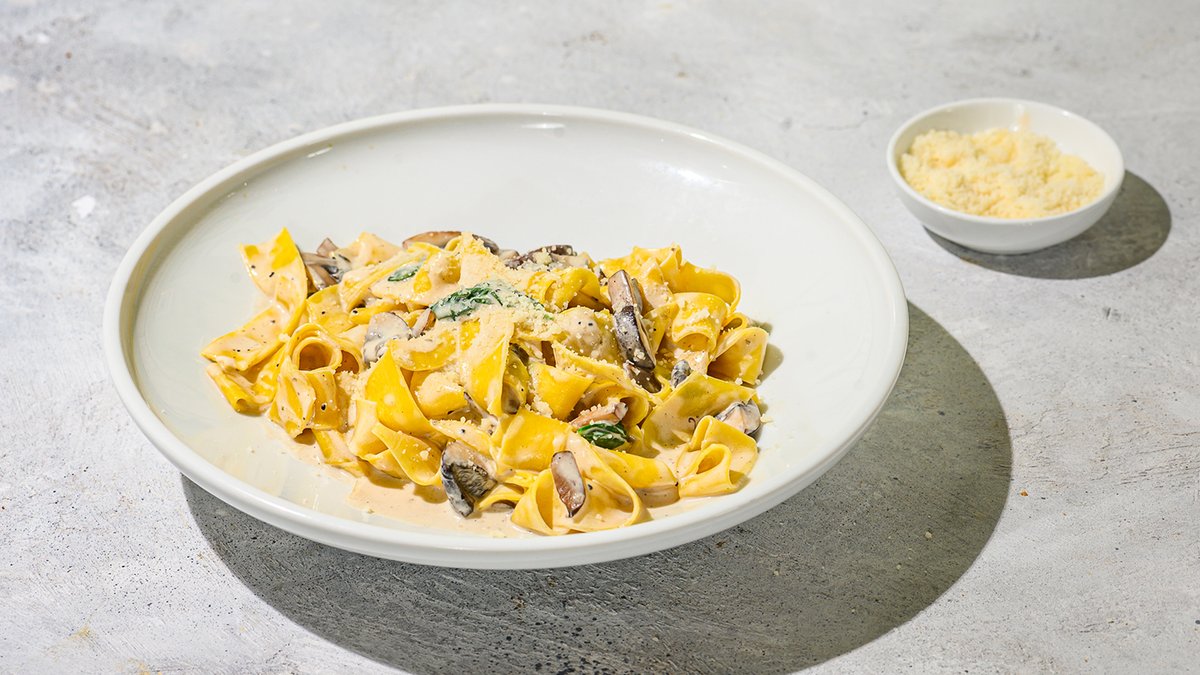 רוטב אלפרדו עשיר, יין לבן, פטריות צלויות, בזיליקום טרי ושלג פרמז’ן