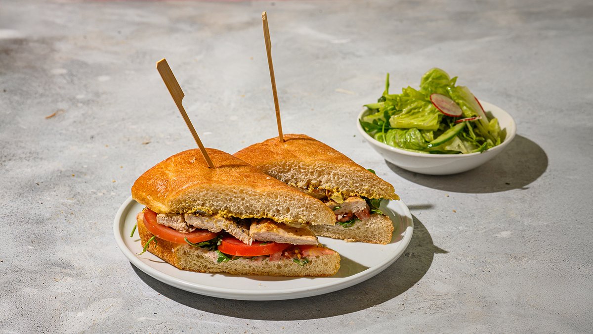 חזה עוף צרוב בצ'באטה שמנמנה עם איולי בצל בסומק, חרדל דיז'ון, רוקט, עגבנייה, צנונית ובצל צלוי. מוגש עם סלט ירוק