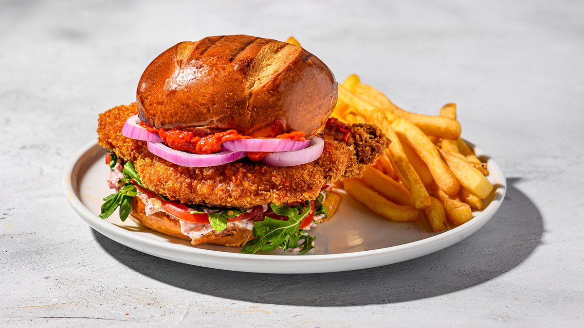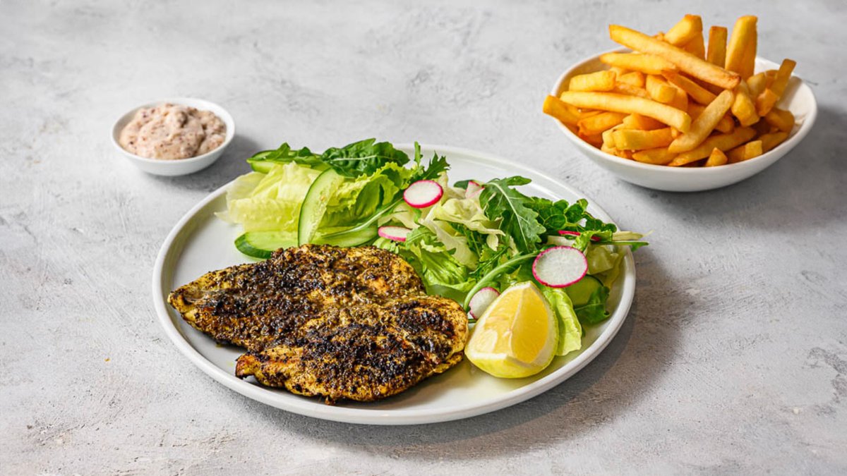 פרגית פריכה מצופה בפנקו מוגשת בלחמנייה רכה עם איולי בצל בסומק, אריסה ולימון כבוש, רוקט, עגבנייה, טבעות בצל סגול ומלפפון חמוץ. מוגש עם צ'יפס