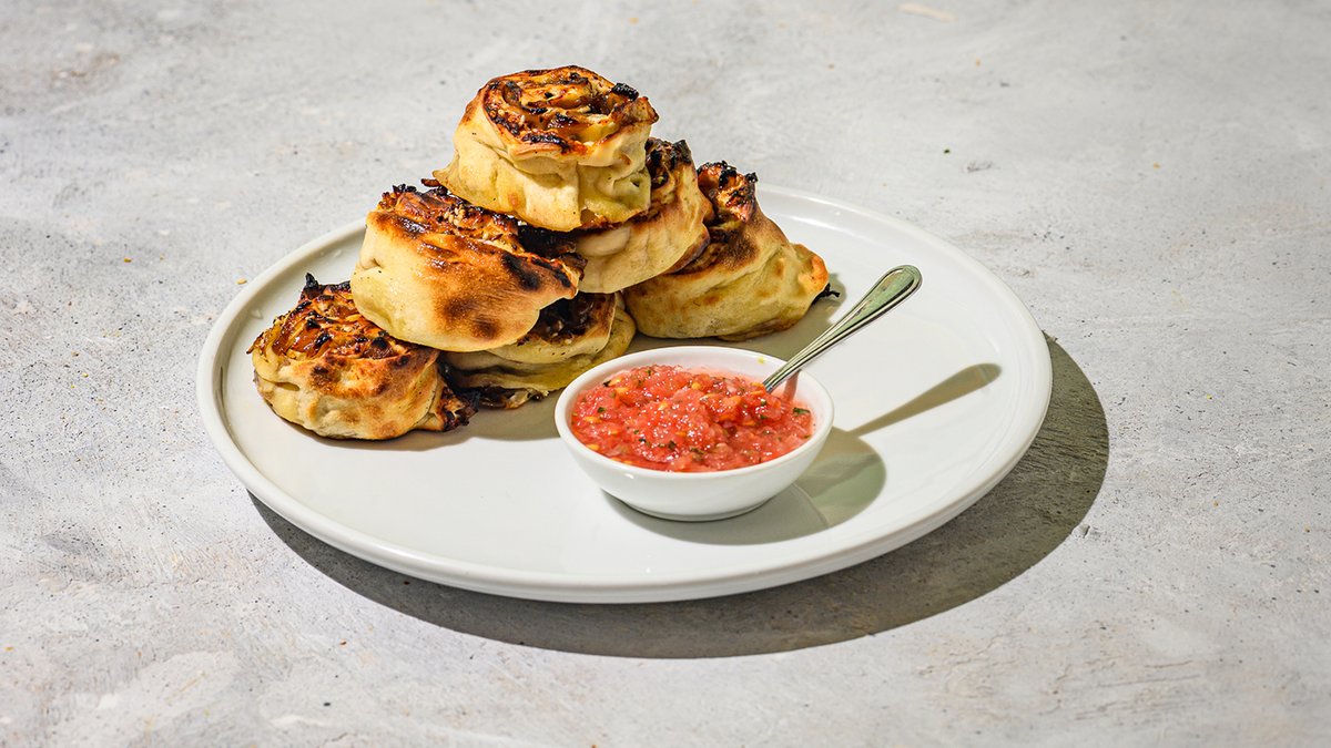 גלגולי בצק בעבודת יד ממולאים בגבינת שמנת ולאבנה, בצל מקורמל, פרמז'ן ושמן זעתר וסומק אפויים על משטח לוהט. מוגשים עם מטבל עגבניות טריות ועשבי תבלין