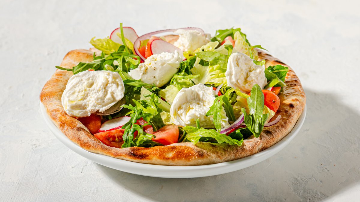 קרעי מוצרלה פרסקה עם חסה קיסר ורוקט, עגבניות שרי, פלפלים קלויים, עגבניות, בצל סגול וצנוניות עם וינגרט בלסמי, מוגשים על פוקאצ'ה טרייה בעבודת יד