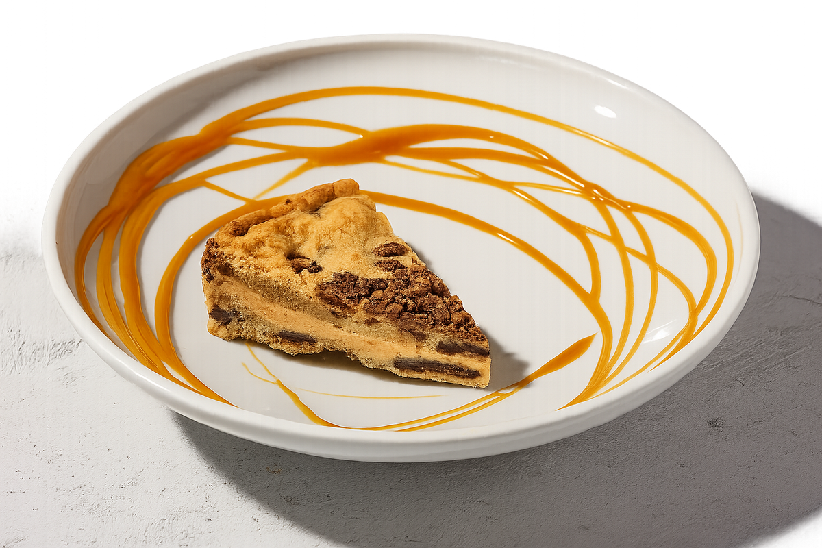 משולש עוגית שוקולד צ'יפס נימוחה ממולאת בקרם קינדר עשיר ורוטב טופי. מוגש ללא גלידה
