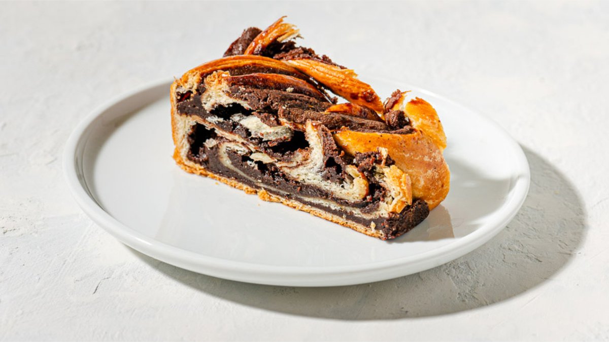 עוגת שכבות בצק שמרים רכה עם קצוות קריספיים ממולאת קרם שוקולד מריר משובח ושוקולד חלב אלרגנים: ביצים, גלוטן, לקטוז וסויה