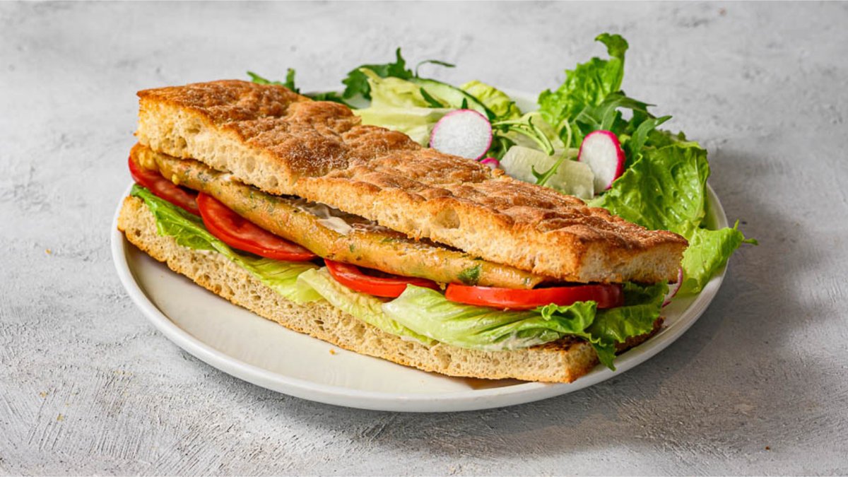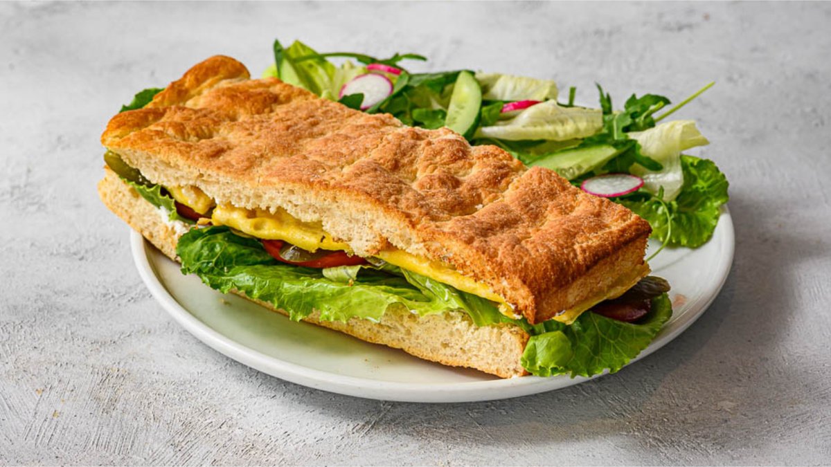 פוקצ'ה חמימה עם חביתה מקופלת, גבינת שמנת (או טחינה), חסה, מלפפון חמוץ ועגבנייה עם מלח ים. מוגש בצד עם סלט ירוק