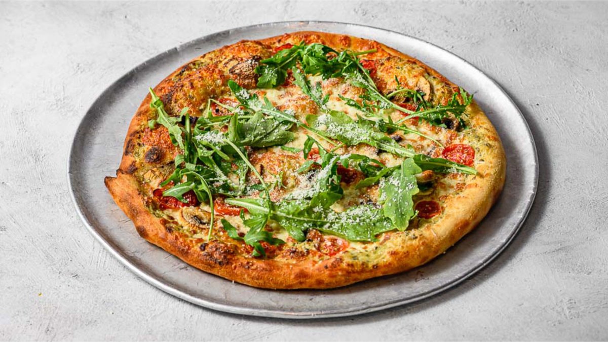 רוטב אלפרדו ופסטו אגוזי, פטריות, מוצרלה ארטיג'ינאלה, עגבניות שרי, רוקט טרי ושלג פרמז’ן