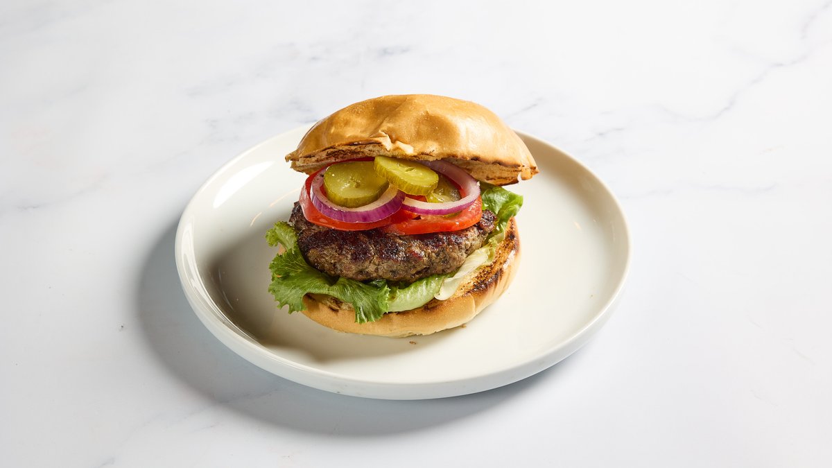 המבורגר בתוספת איולי ברביקיו וצ׳דר טבעוני