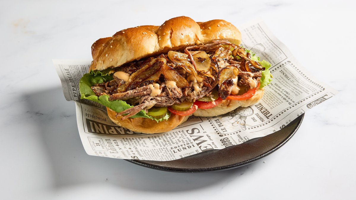 מוגש עם חסה לליק, עגבניה, מלפפון חמוץ, איולי ובצל קריספי