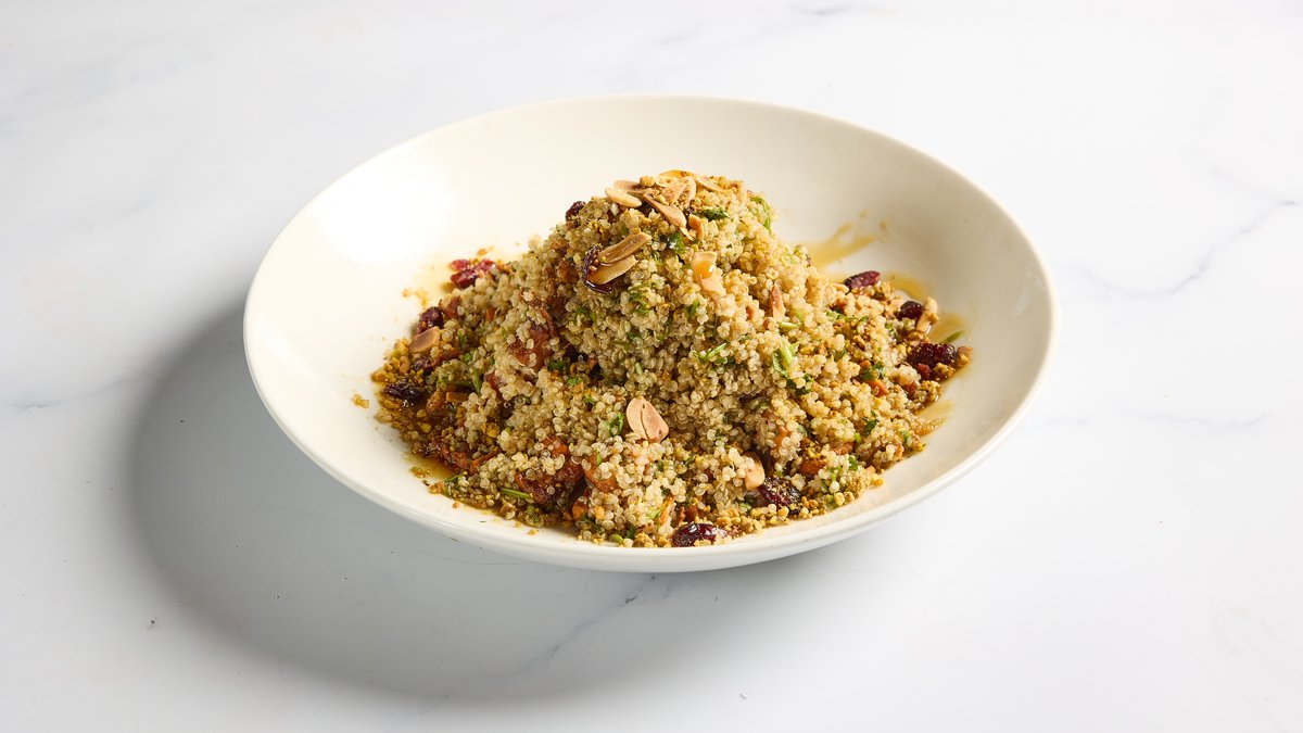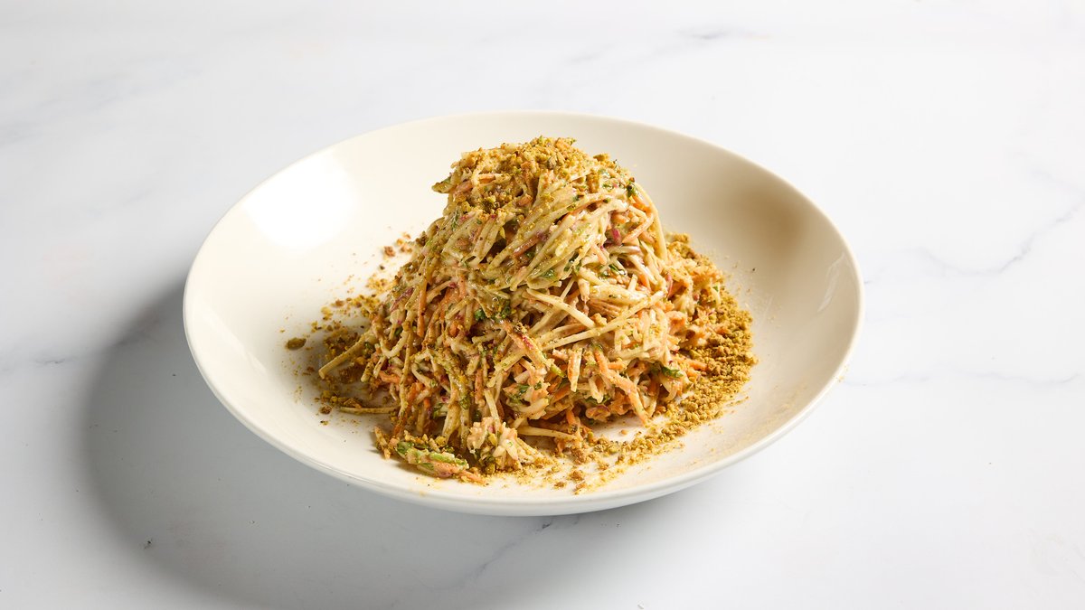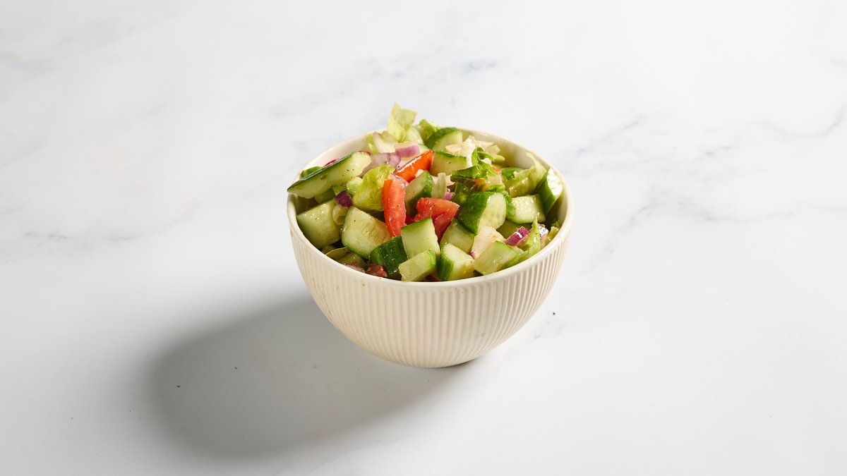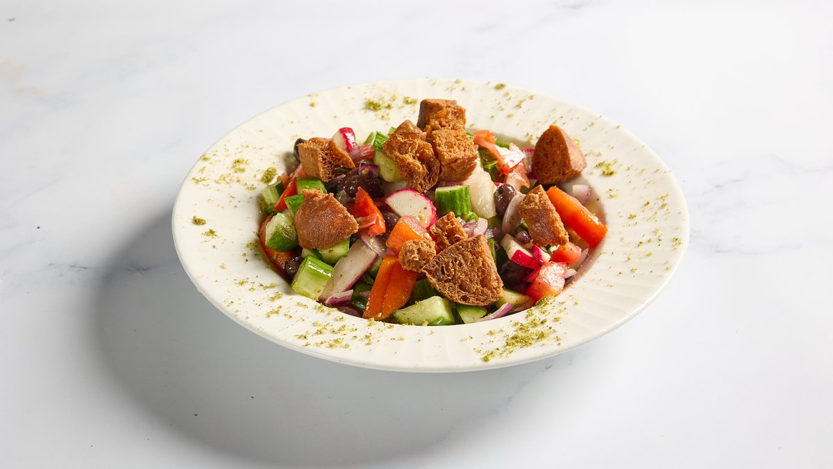מלפפון, עגבניה, בצל סגול, גמבה, צנונית, זעתר וקרוטונים