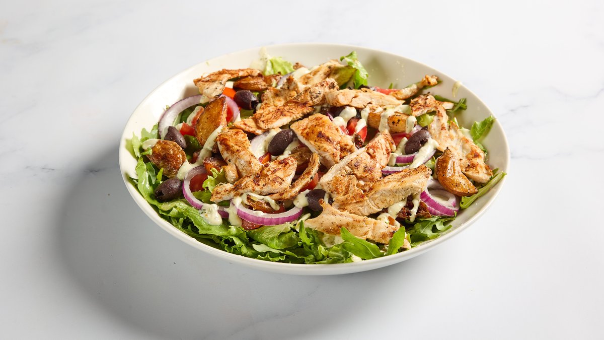 חסה, זיתי קלמטה, עגבניה, תפו״א ורוטב קיסר